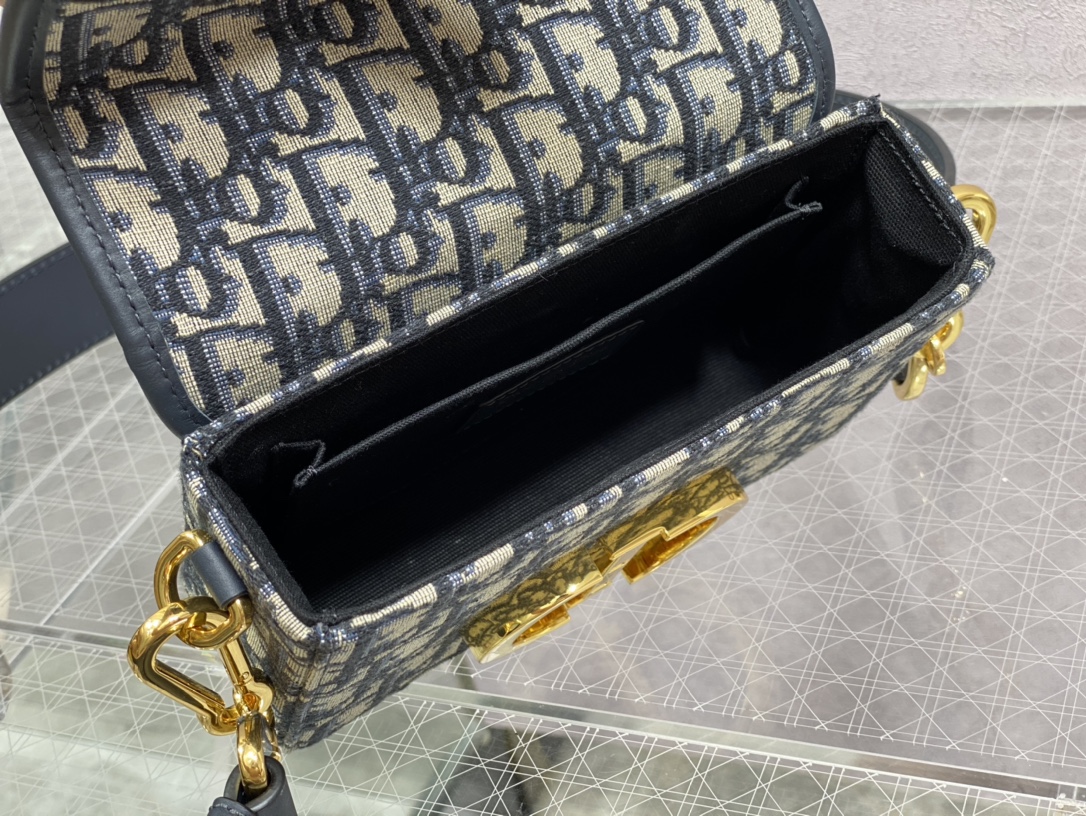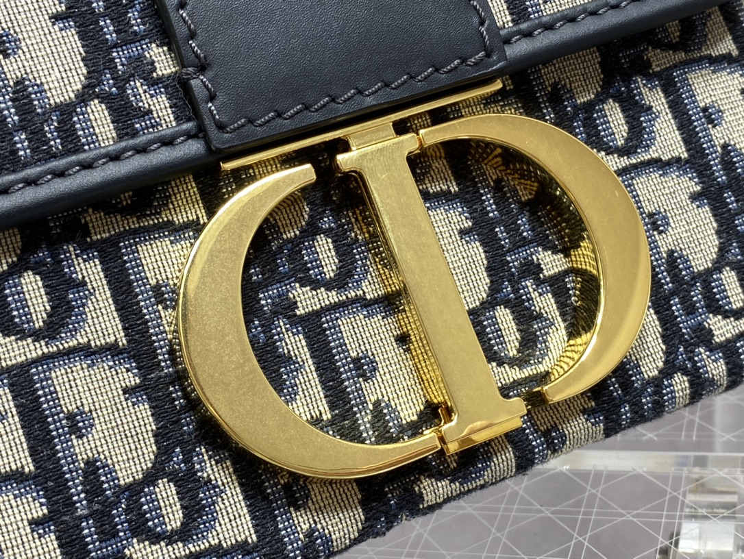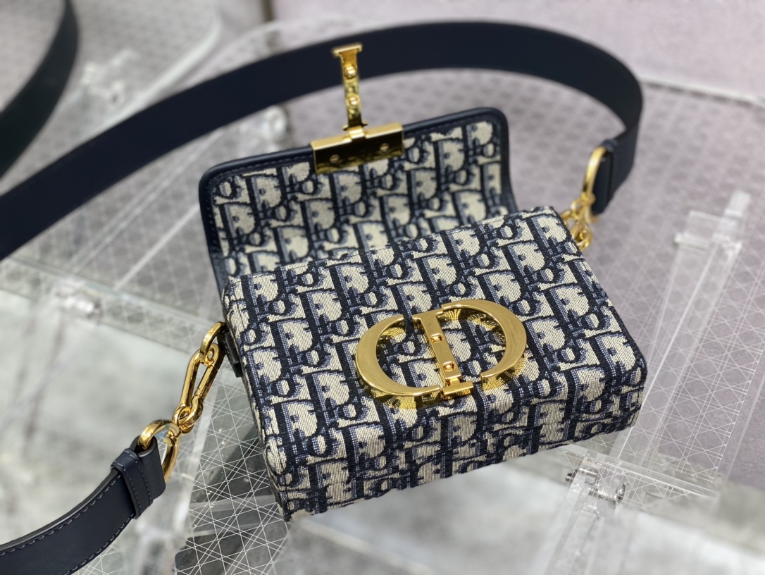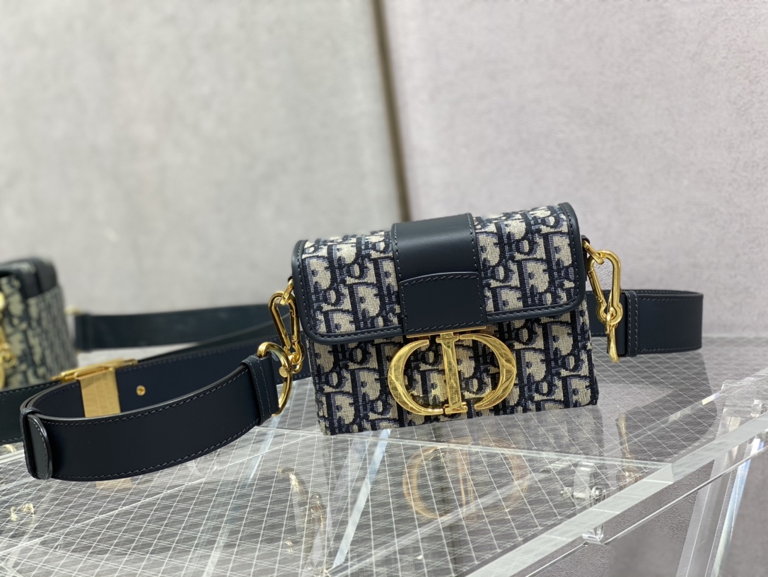 The 30 Montaigne line is inspired by the emblematic address and offers essential pieces that embody the House's iconic codes. The compact handbag is crafted in blue Dior Oblique jacquard for an elegant and modern look. The flap is embellished with an antique gold-finish metal 'CD' clasp, inspired by the seal of a Christian Dior perfume bottle. Refined details, such as an embossed '30 MONTAIGNE' signature on the back and the military-inspired buckle define this unique design. Featuring an adjustable leather shoulder strap, the bag may be carried by hand, worn over the shoulder or crossbody.