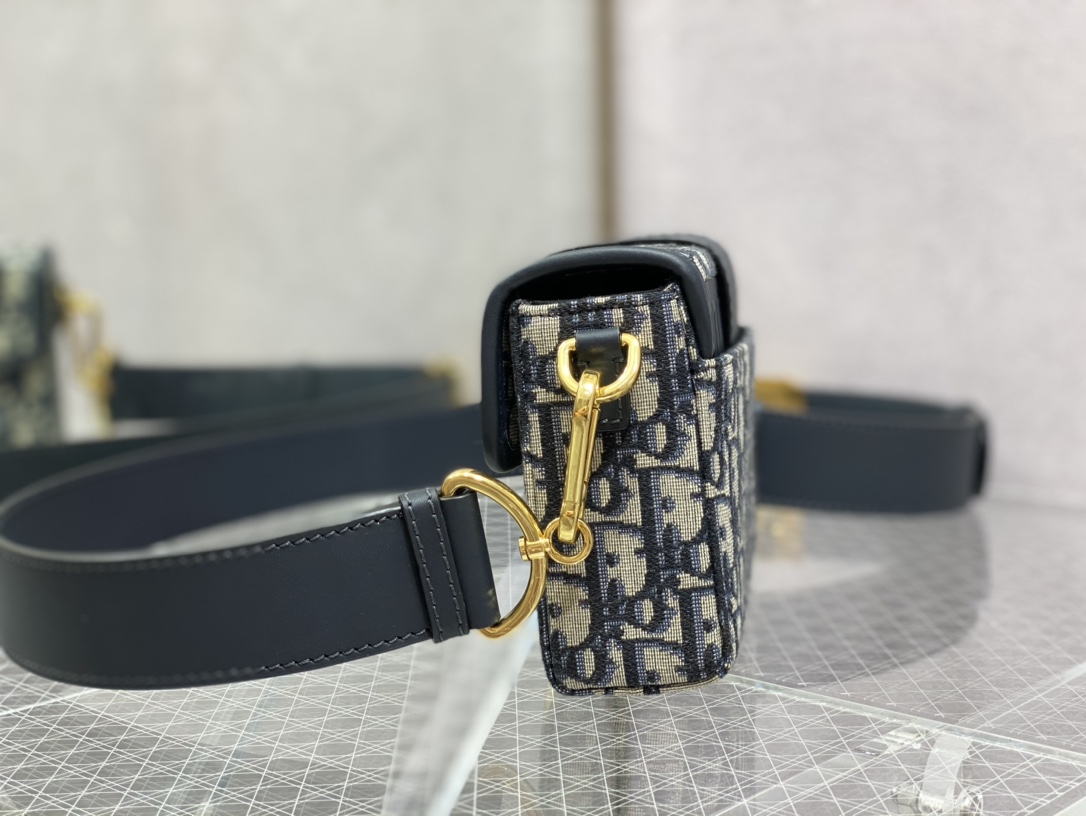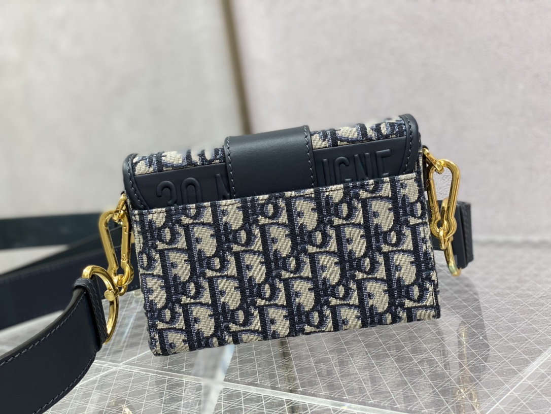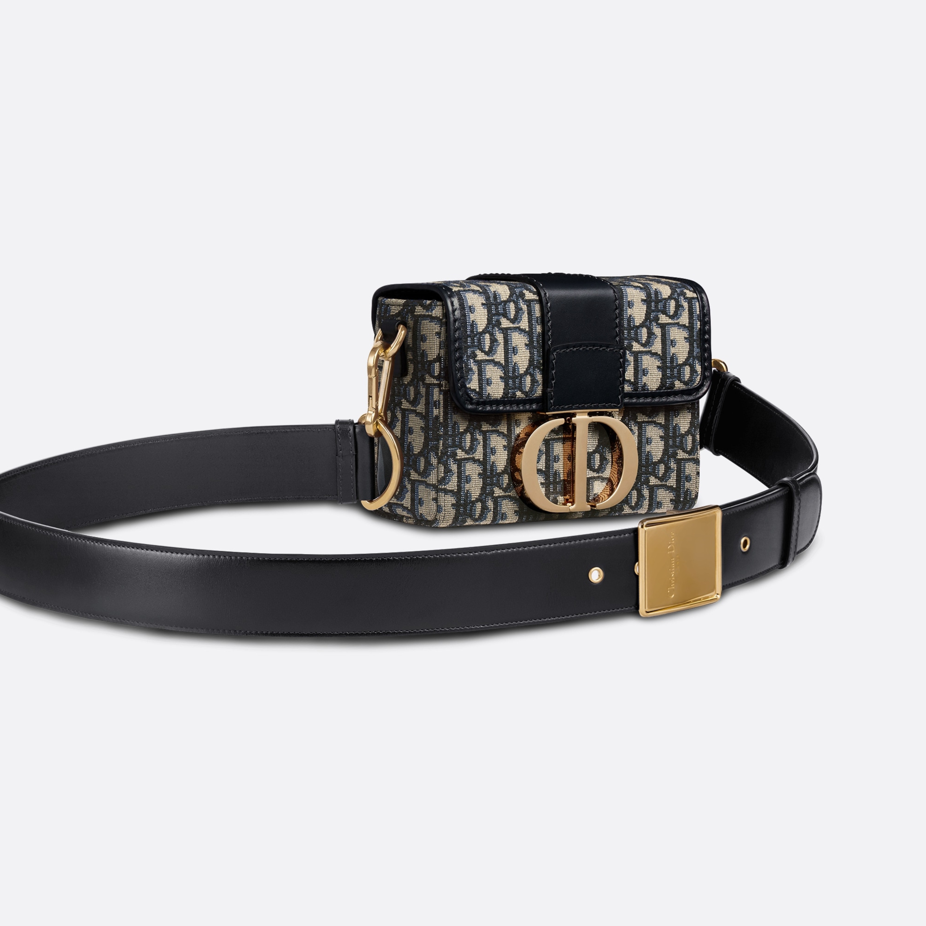 The 30 Montaigne line is inspired by the emblematic address and offers essential pieces that embody the House's iconic codes. The compact handbag is crafted in blue Dior Oblique jacquard for an elegant and modern look. The flap is embellished with an antique gold-finish metal 'CD' clasp, inspired by the seal of a Christian Dior perfume bottle. Refined details, such as an embossed '30 MONTAIGNE' signature on the back and the military-inspired buckle define this unique design. Featuring an adjustable leather shoulder strap, the bag may be carried by hand, worn over the shoulder or crossbody.