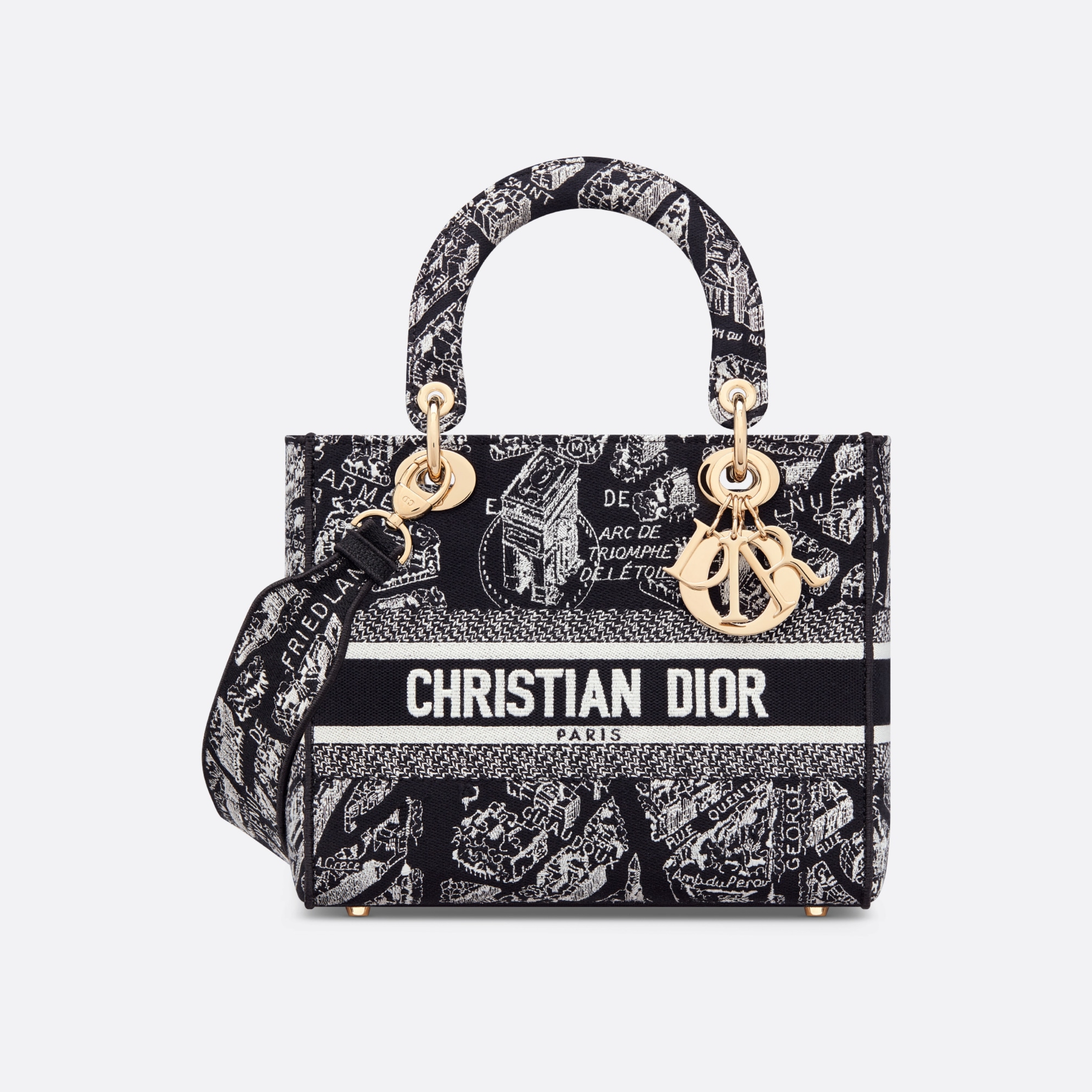 The Lady D-Lite bag combines classic elegance with House modernity. The style is fully embroidered with the season's signature black and white Plan de Paris motif, inspired by House archives and centered around Dior's historic address on Avenue Montaigne. The front features a Christian Dior Paris signature while the D.I.O.R. charms in pale gold-finish metal embellish and illuminate the silhouette. Equipped with a wide, reversible and removable embroidered shoulder strap, the medium Lady D-Lite bag can be carried by hand or worn crossbody.