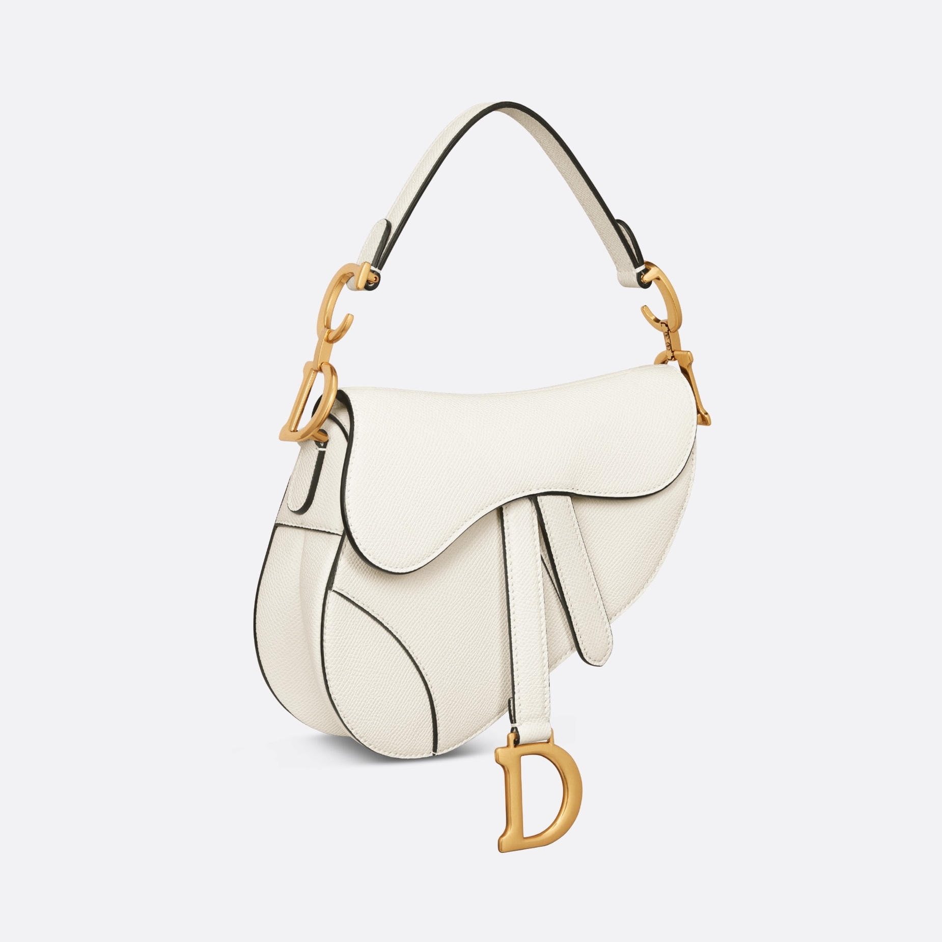 Maria Grazia Chiuri brings a fresh update to the iconic Saddle bag. Crafted in latte grained calfskin, the legendary design presents a Saddle flap with a magnetic 'D' stirrup clasp, as well as an antique gold-finish metal 'CD' signature on either side of the strap. Featuring a thin, adjustable and removable shoulder strap, the miniature Saddle bag may be carried by hand, worn over the shoulder or crossbody.