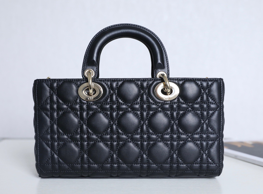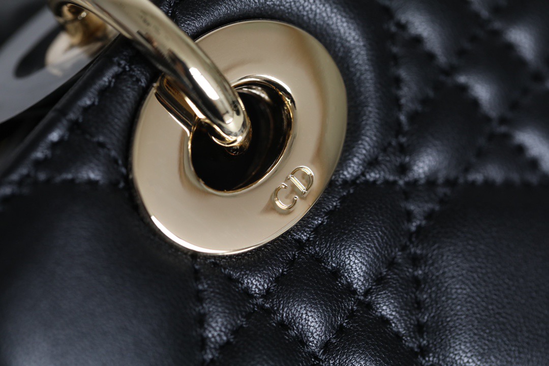 dy D-Joy bag captures the House's vision of elegance and beauty by showcasing the iconic streamlined aesthetic of the Lady Dior line. Crafted in black lambskin with Cannage stitching, the refined and timeless style is enhanced by pale gold-finish metal D.I.O.R. charms elegantly embellishing its silhouette. Featuring one removable chain shoulder strap and another adjustable and removable leather shoulder strap, the small Lady D-Joy bag can be carried by hand, worn over the shoulder or crossbody as a daily companion.