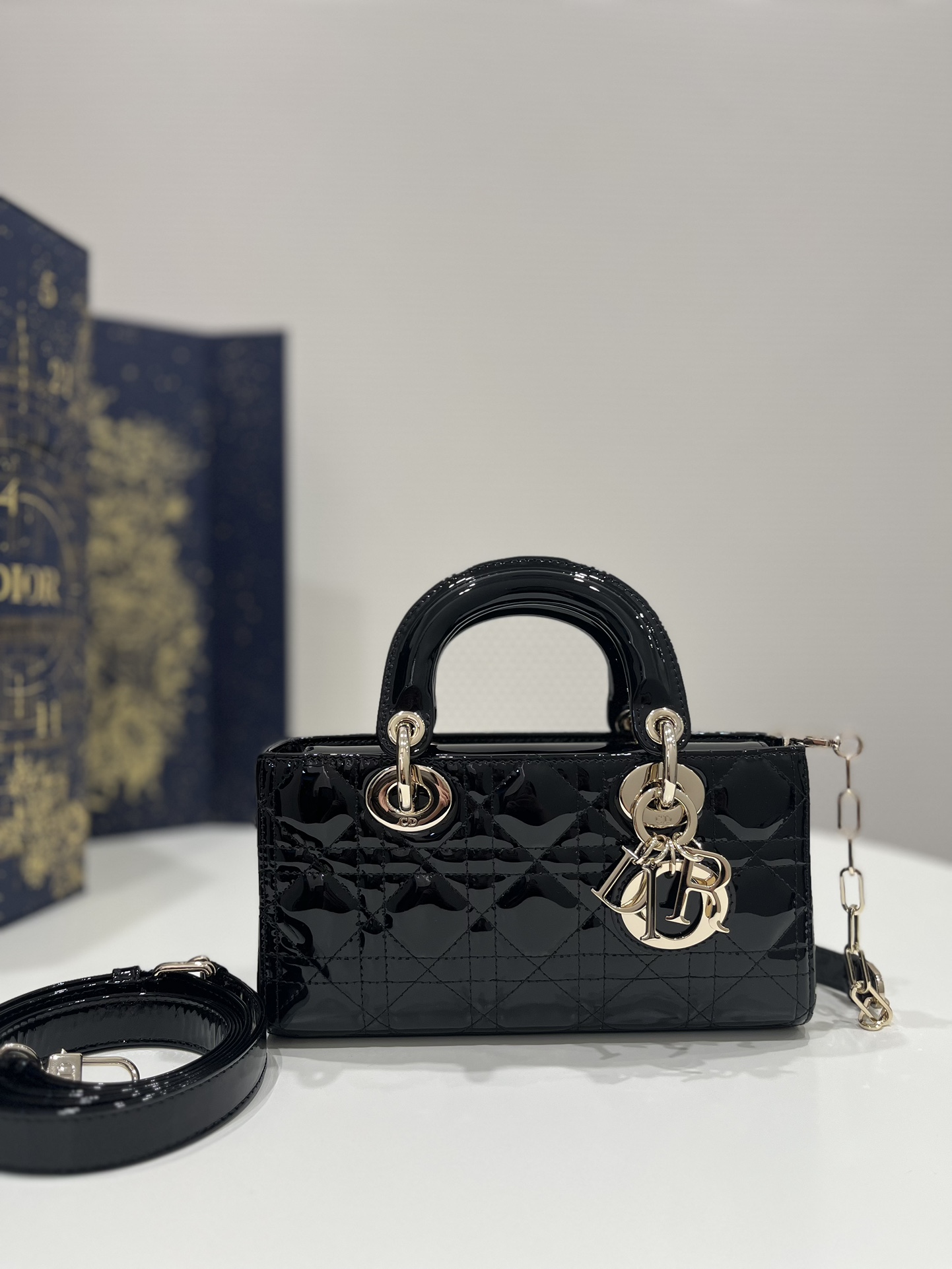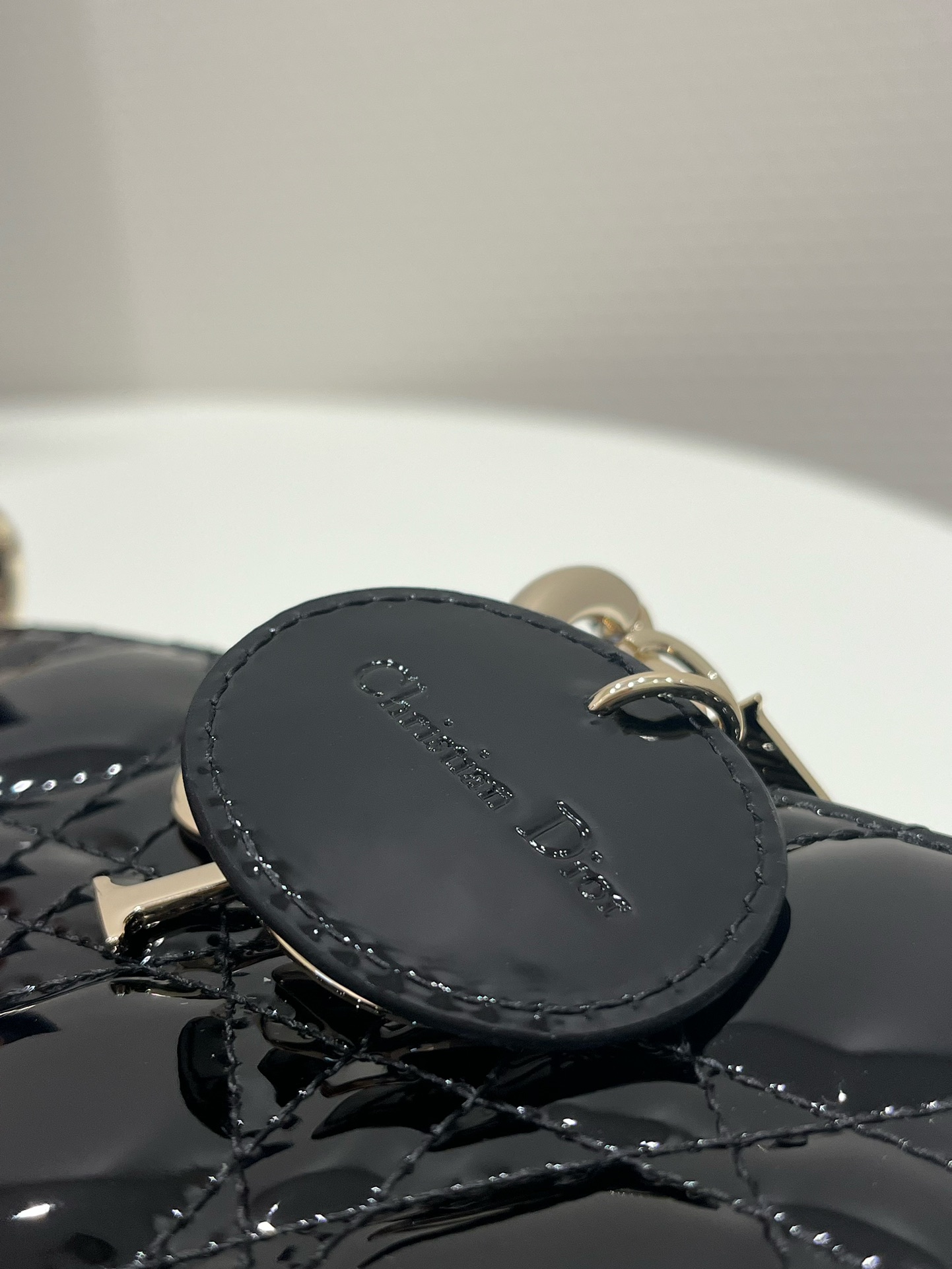 The Lady D-Joy bag captures the House's vision of elegance and beauty by showcasing the iconic streamlined aesthetic of the Lady Dior line. Crafted in black patent calfskin with Cannage stitching, the legendary quilted texture is immediately recognizable. Pale gold-finish metal D.I.O.R. charms embellish and illuminate its silhouette. Featuring one removable chain strap and another adjustable and removable leather strap, the small Lady D-Joy bag can be carried by hand, worn over the shoulder or crossbody as a daily companion.